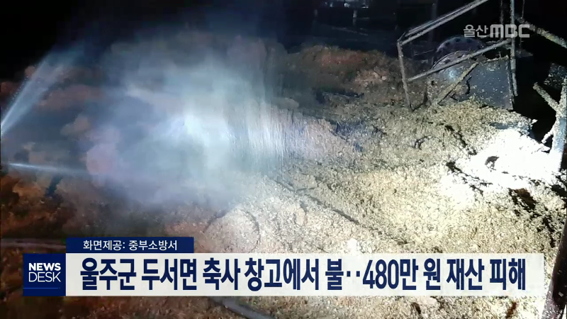오늘(1/13) 새벽 4시 10분쯤 울주군 두서면 복안리의 한 축사 창고에서 불이 나 창고 면적 약 95제곱미터와 소 2마리 등을 태워 소방서 추산 480만원의 재산 피해를 내고 1시간 40분만에 꺼졌습니다. 소방당국은 축사 창고 지붕에서 불이 시작된 것으로 보고 화재 발생 경위를 조사하고 있습니다. //