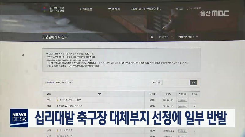 태화강국가정원 지정으로 십리대밭 축구장이 주차장으로 전환되면서 중구가 축구장 대체부지를 찾고 있는 가운데 뒤늦게 대체부지에 포함된 것을 알게 된 일부 주민들이 반발하고 있습니다. 중구청장에게 바란다 게시판에는 야간 소음, 빛공해 등을 우려하며 다른 곳에 지어 달라고 요청하는 축구장 예정지 주변 지주와 거...