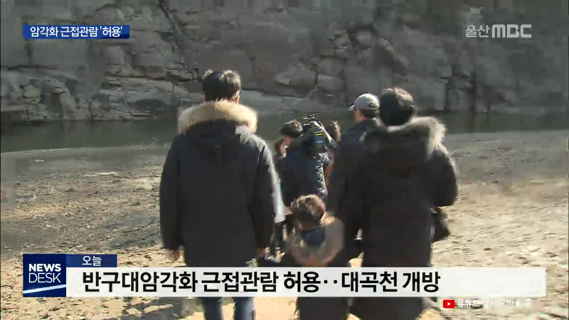 ◀ANC▶ 오늘(1/11)부터 국보 제285호 반구대암각화를 보다 가까이에서 볼 수 있는 프로그램이 운영됩니다. 기존에는 망원경을 이용해 바위에 새겨진 그림을 볼 수 있었는데요. 근접관람 개방 행사 첫날, 최지호 기자가 현장을 다녀왔습니다. ◀END▶ ◀VCR▶ 반구대암각화 전망대 철문이 열리고, 관람객들이 하나둘 하...