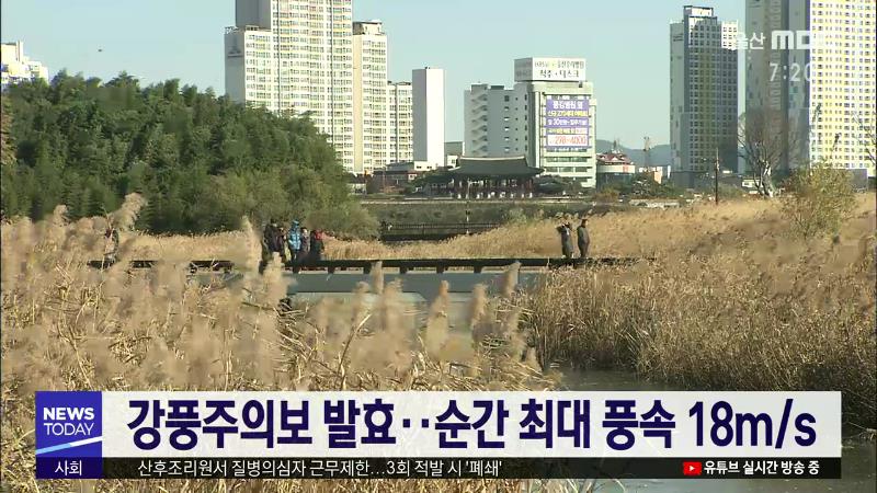 오늘(1/8) 울산지방은 순간 최대 풍속 18m/s의 강한 바람으로 강풍주의보가 내려진 가운데 아침 최저 8도 낮 최고 10도의 기온 분포를 보이겠습니다. 내일은 대체로 맑겠으나 기온이 다소 떨어져 아침 최저 0도로 시작해 낮 최고 8도가 예상됩니다. 울산기상대는 강풍주의보가 오늘 밤까지 이어지며 바람 매우 강하게 불겠...