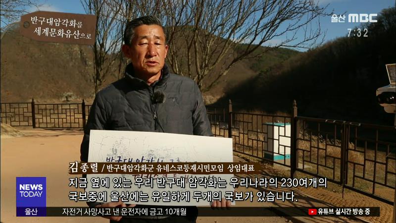 김종렬 / 반구대암각화군 유네스코등재시민모임 상임대표 지금 옆에 있는 우리 반구대 암각화는 우리나라의 230여개의 국보중에 울산에는 유일하게 두개의 국보가 있습니다.그게 바로 천전리암각화와 지금 옆에 있는 반구대암각화 285호입니다. 반구대암각화는 울산 시민의 자존심이라고 생각합니다.그래서 지금 이 암각화 ...