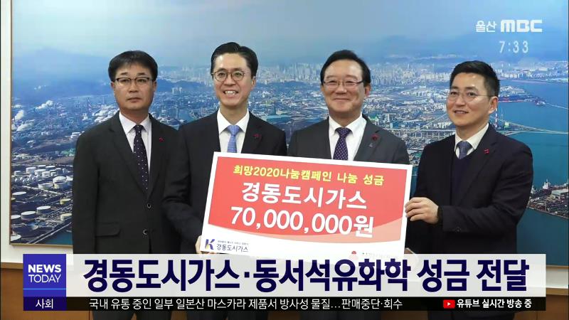 경동도시가스가 오늘(1/7) 시청을 찾아 이웃돕기 성금으로 써달라며 7천만 원을 전달했습니다. 경동도시가스는 최근 4년 동안 태풍 차바 피해돕기 성금 등으로 2억 3천만 원을 기탁했습니다. 동서석유화학도 시청을 방문해 이웃돕기 성금으로 2천만 원을 기탁했습니다. //