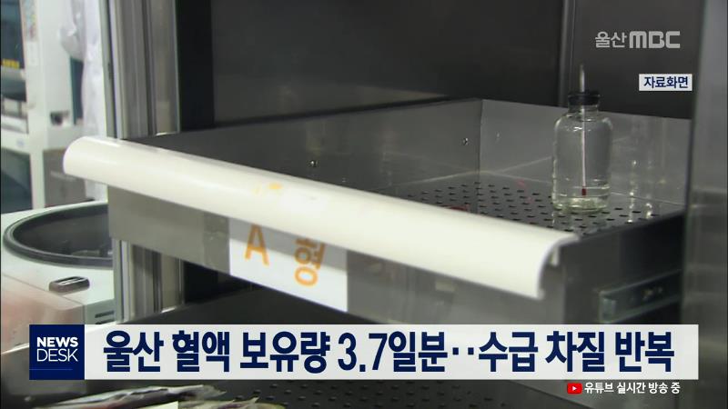 울산지역의 혈액 보유량이 3.7일분에 불과해 올 겨울철에도 혈액 수급에 차질이 예상됩니다. 대한적십자사 울산혈액원에 따르면 오늘(1/3)자 기준 혈액 보유량은 3.7일분으로, 적정 기준치 5일분보다 1.3일분이 부족하며 특히 AB형의 경우 2.2일분만 남아 있어 가장 적습니다. 혈액원은 학생들이 겨울 방학에 들어갔고 추운...