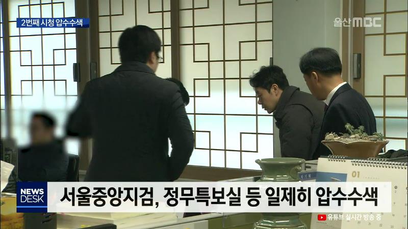 ◀ANC▶ 울산시장 선거 관련 의혹을 수사 중인 검찰이 오늘(1/4) 울산시청에 대한 압수수색을 진행했습니다. 약 한달 전에 이어 두 번째 압수 수색인데요. 검찰이 최근 구속영장이 기각된 송병기 경제부시장에 대한 보강 수사에 나선 것으로 보입니다. 유영재 기자 ◀END▶ ◀VCR▶ 서울중앙지검이 울산시청 압수 수색에...