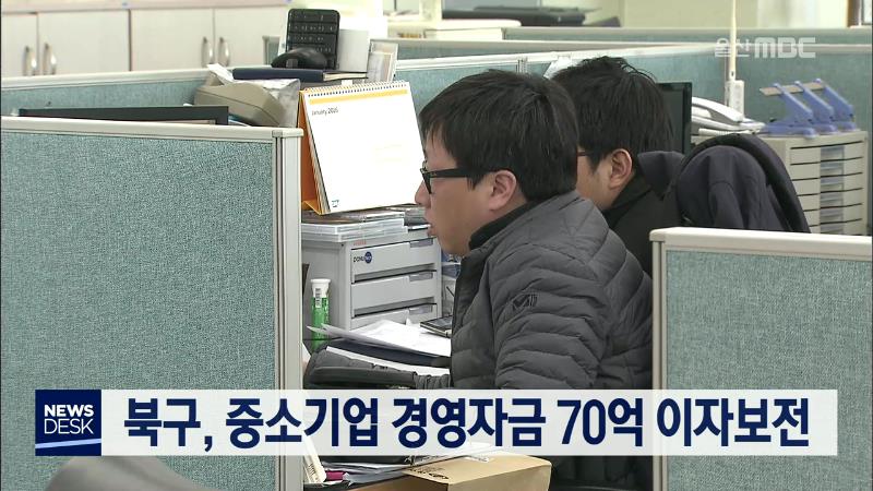 북구청이 중소기업 자금난 해소를 위해 오는 6일부터 70억원의 융자를 지원합니다. 지원대상은 북구 지역 제조업 중소기업으로 여성기업과 장애인기업, 2019년 태풍피해기업을 우선 지원합니다. 업체당 지원한도는 2억원이며 2년 동안 북구가 3%의 이자를 보전합니다.