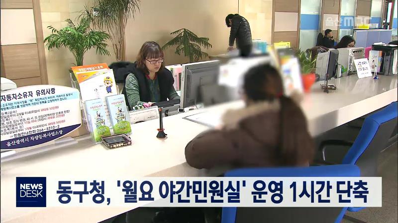 동구청이 정해진 시간에 구청 방문이 어려운 민원인들을 위해 매주 월요일마다 운영해 온 '월요 야간 민원실' 운영시간을 오는 6일부터 1시간 단축합니다. 동구청은 그동안 민원실을 오후 6시부터 9시까지 운영해 왔지만, 인터넷으로 민원처리가 이뤄지면서 오후 8시 이후 방문객이 평균 1명에 불과해 단축하게 됐다고 밝혔...