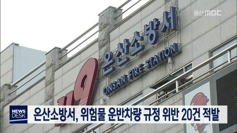 온산소방서가 지난달 23일부터 31일까지 온양IC 등에서 위험물 운반 차량에 대해 불시 검사를 실시한 결과, 20건의 위반차량을 발견했다고 밝혔습니다. 검사 대상은 이동탱크 저장소와 위험물 적재차량 100여대이며, 위험물 적재기준 위반 여부와 차량 안전 확보사항, 위험물 운송자 자격 취득 여부 등을 확인했습니다. //