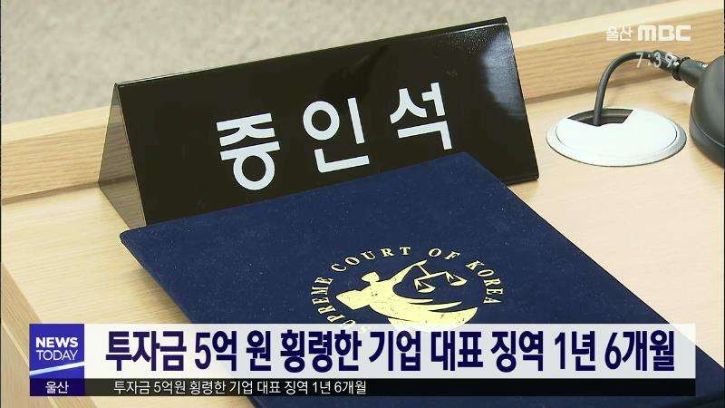 울산지법 형사3단독 김주옥 부장판사는 수억 원 대 투자금을 횡령한 혐의로 기소된 기업체 대표 70살 A씨에게 징역 1년 6개월을 선고했습니다. A씨는 2015년 4월 다른 기업체 대표 B씨와 새로운 제품 제조기술과 설비를 개발하기 위해 '신규 제휴법인 설립 계약'을 체결한 뒤 B씨의 투자금 4억9천여만원을 개인 용도로 횡령...