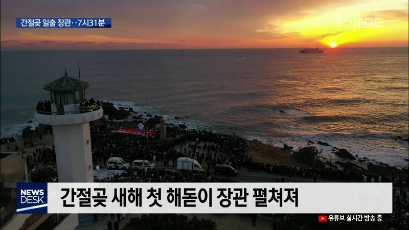 ◀ANC▶ 한반도에서 새해 첫 해를 가장 빨리 맞이할 수 있는 간절곶에 일출의 장관이 펼쳐지며 2020년 경자년의 아침을 밝혔습니다. 많은 해맞이객들이 간절곶을 찾아 새해 소망을 빌며 희망찬 새 출발을 다짐했습니다. 이용주 기자입니다. ◀END▶ ◀VCR▶ 오전 7시 31분. 구름 한 점 없는 수평선 위로 경자년의 첫 아...