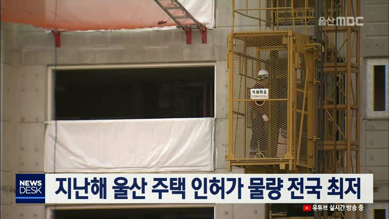 지난해 울산 지역 주택 인허가 물량이 전국에서 가장 적고, 지난해와 비교한 감소율도 전국에서 가장 컸던 것으로 나타났습니다. 국토교통부가 집계한 지난해 11월 말 기준 울산 지역 주택 인허가 실적은 3천539가구로 전년도 같은 기간에 비해 65.5% 급감했고, 5년 평균에 비해서는 69.5% 줄었습니다. 지난해 11월 말 기준...