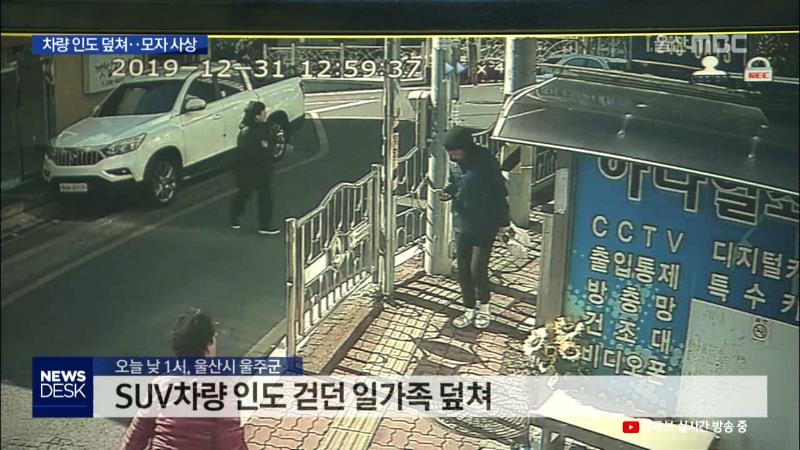 ◀ANC▶ 오늘 낮 울산의 한 주택가에서 차량 한대가 인도를 덮쳤습니다. 이 사고로 러시아 국적 어머니가 다치고 유모차에 타고 있던 2살 배기 아들이 숨졌습니다. 이 어머니는 뱃속에 아이를 임신한 상태여서 안타까움을 더하고 있습니다. 김문희 기자. ◀END▶ ◀VCR▶ 오늘(12/31) 낮 1시쯤, 울산시 울주군의 한 아파...