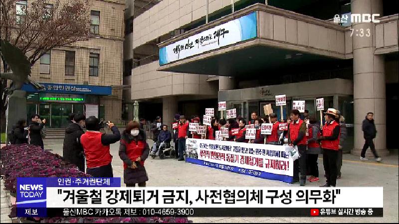 ◀ANC▶ 요즘 대구 전역이 공사판이라고 해도 될 정도입니다. 도시정비사업이라는 이름으로 원래 있던 집을 허물고 아파트를 짓는 재개발, 재건축 사업이 진행되고 있는 곳이 140여 군데에 이릅니다. 원래 살던 곳에서 쫓겨나는 사람들도 그만큼 늘고 있다는 이야긴데, 겨울철만큼은 강제철거를 중단해야 한다는 목소리가 ...