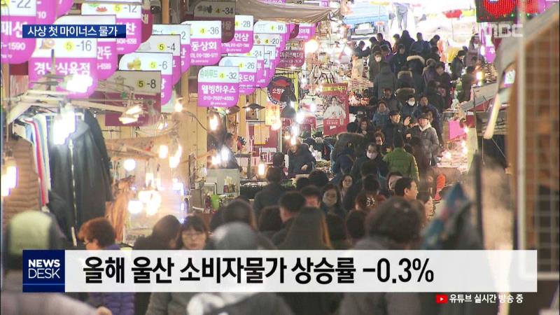 ◀ANC▶ 올해 울산 소비자물가 상승률이 사상 처음으로 마이너스를 기록했습니다. 경기 부진이 길어지면서 소비심리가 역대 최악으로 꽁꽁 얼어붙었다는 겁니다. 다만 내년에는 조선업이 회복하며 지역 경기 회복을 이끌 동력이 될 전망입니다. 이돈욱 기자입니다. ◀END▶ ◀VCR▶ 동남지방통계청이 발표한 올 한해 울...