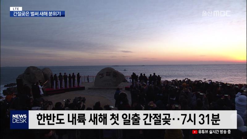 ◀ANC▶ 2019년이 이제 몇 시간 남지 않았는데요. 한반도에서 경자년의 새해 첫 일출을 가장 먼저 볼 수 있는 울주군 간절곶에는 새해를 맞으려는 관광객들이 모여들고 있습니다. 현장을 LTE로 연결합니다. 유희정 기자, 현장 분위기 전해 주시죠. ◀END▶ ◀ 기 자▶ 네, 저는 한반도에서 가장 먼저 새해 일출을 볼 수 있...