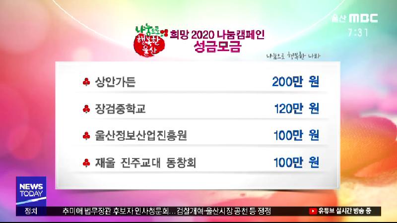 다음은 '희망 2020 나눔캠페인'에 참여해주신 분입니다. ㈜덕양 임직원 일동 5,133만 원 효성㈜울산공장 4,600만 원 삼영순화㈜온산공장 임직원 일동 1,139만 원 서연이화와 서연이화협력회 500만 원 울산광역시산림조합 500만 원 울산시문화관광해설사회 225만 원 대한유화노동조합 200만 원 세상을 아름답게 만드는 사람...