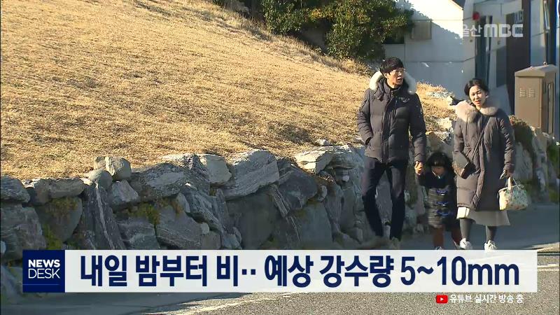 2019년의 마지막 주말인 오늘(12/28) 울산은 맑은 날씨를 보인 가운데 낮 최고기온은 평년과 비슷한 8.5도를 기록했습니다. 휴일인 내일(12/29)은 구름이 많다가 낮부터 점차 흐려지겠고, 기온은 0도에서 9도로 오늘과 비슷하겠습니다. 내일 밤부터는 비가 내리겠고, 예상 강수량은 모레 새벽까지 5~10mm로 많지 않겠습니다...