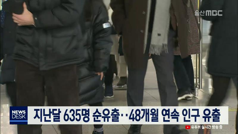 지난달에도 울산 지역 인구가 635명 순유출되며, 인구 유출이 48개월째 계속되고 있습니다. 통계청의 11월 국내 인구이동 결과를 보면 울산으로의 전입 인구는 1만 1천173명에 그쳤지만, 전출 인구는 1만 1천808명을 기록하며 635명이 울산을 빠져나간 것으로 나타났습니다. 지난달 울산 지역 인구 이동률도 -0.7%를 기록하...