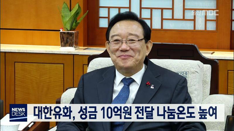 대한유화는 오늘(12/26) 울산시청을 찾아 울산사회복지공동모금회에 희망 2020 나눔캠페인 이웃돕기 나눔 성금으로 10억 원을 쾌척했습니다. 대한유화는 지난해에도 20억 원을 울산지역 어려운 이웃들을 위한 성금으로 기부했습니다. 이번 기부를 통해 지난해보다 저조한 울산지역 나눔온도가 30도를 넘었습니다.//