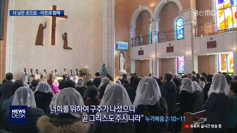 ◀ANC▶ 성탄절을 맞아 울산에서도 아기 예수의 탄생을 축하하는 행사가 열렸습니다. 소외되고 가난한 사람들을 위해 찾아온 예수 그리스도의 뜻을 기억하고 함께 나누는 삶을 실천하자는 다짐이 이어졌습니다. 유희정 기자. ◀END▶ ◀VCR▶ "온 백성에게 미칠 큰 기쁨의 좋은 소식을 너희에게 전하노라. 너희를 위하여...
