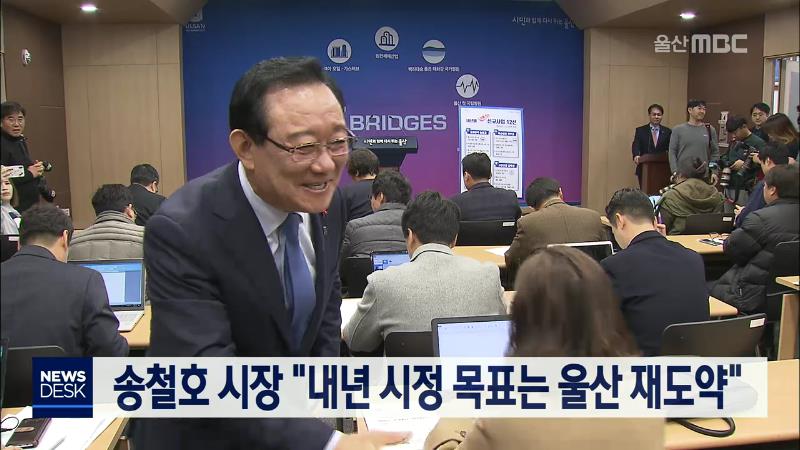 송철호 울산시장은 오늘(12/25) 낸 신년사를 통해 2020년 새해 시정의 최우선 목표는 울산의 재도약이라고 밝혔습니다. 송철호 시장은 신년사에서 민선 7기 울산시가 그동안 불황 탈출이라는 목표를 위해 전진해 왔다며, 내년에는 울산이 장기불황이라는 안개에서 벗어나 재도약을 향해 나가는 한 해가 되기를 기도한다고 ...