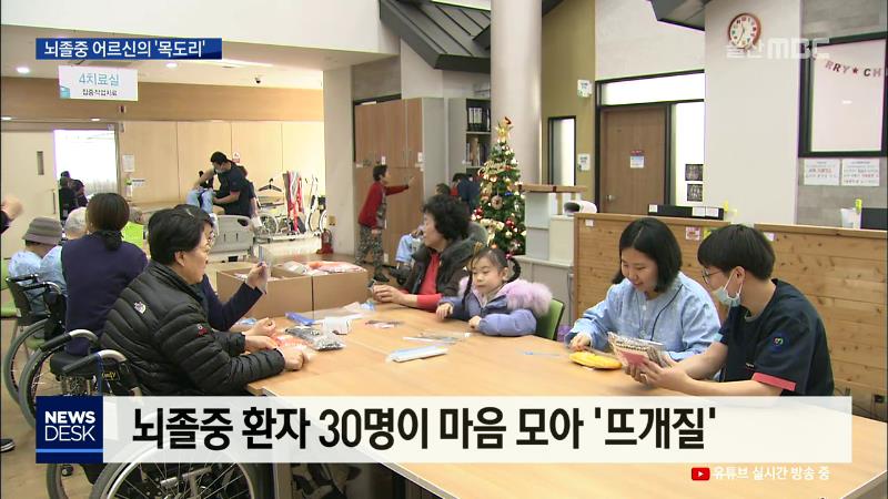 ◀ANC▶ 평균 연령 70대인 뇌졸중 환자들이 미혼모 가정 아이들에게 '특별한 선물'을 전달했습니다. 한땀 한땀 정성을 담은 뜨개질로 목도리를 만든 건데요. 연말을 맞아 이웃 사랑의 의미를 되돌아보게 합니다. 김문희 기자가 취재했습니다. ◀END▶ ◀VCR▶ 울산 중구의 한 요양병원. 휠체어에 앉은 할아버지와 할머니...