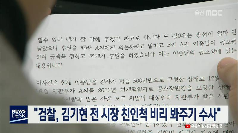 울산적폐청산시민연대는 오늘(12/23) 김기현 전 울산시장 친인척 비리에 관련해 봐주기 수사를 한 담당검사를 고발한다고 밝혔습니다. 적폐청산시민연대는 지난 2012년 SK 협력사 대표 이종남 씨가 김기현 국회의원의 회계담당자인 처사촌과 공모해 쪼개기 후원금 2천만 원을 입금했지만, 검찰은 회계책임자 신분이 아닌 20...