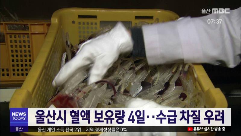 올해 겨울철에도 혈액 수급에 차질이 예상됩니다. 대한적십자사 울산혈액원은 지난 17일 기준으로 혈액 보유량은 4일분으로, 적정 기준치 5일분보다 1일분이 부족하다고 밝혔습니다. 시는 아직 `주의` 전 단계지만, 이런 현상이 이어지면 내년 2∼3월에는 혈액 보유량이 주의나 경계 단계로 떨어져 혈액 수급에 차질이 우려...