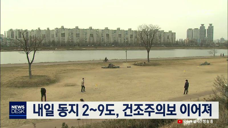 주말인 오늘(12/21) 울산지방은 구름 많은 가운데 낮 최고 기온이 어제보다 2.5도 낮은 5.3를 기록해 쌀쌀했습니다. 동지이자 일요일인 내일은 구름 많다가 늦은 오후부터 차차 맑아지겠으며, 2도에서 9도의 기온분포속에 미세먼지 농도는 종일 나쁨 수준을 유지하겠습니다. 울산기상대는 울산지역에 사흘째 건조주의보가 ...