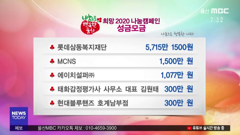 다음은 '희망 2020 나눔캠페인'에 참여해주신 분입니다. ------------------------------------------- 롯데삼동복지재단 5,715만 1500원 MCNS 1,500만 원 에이치설퍼㈜ 1,077만 원 태화감정평가사 사무소 대표 김원태 300만 원 현대블루핸즈 호계남부점 300만 원 한국전력국제원자력대학원대학교 200만 원 울산제일로타리...