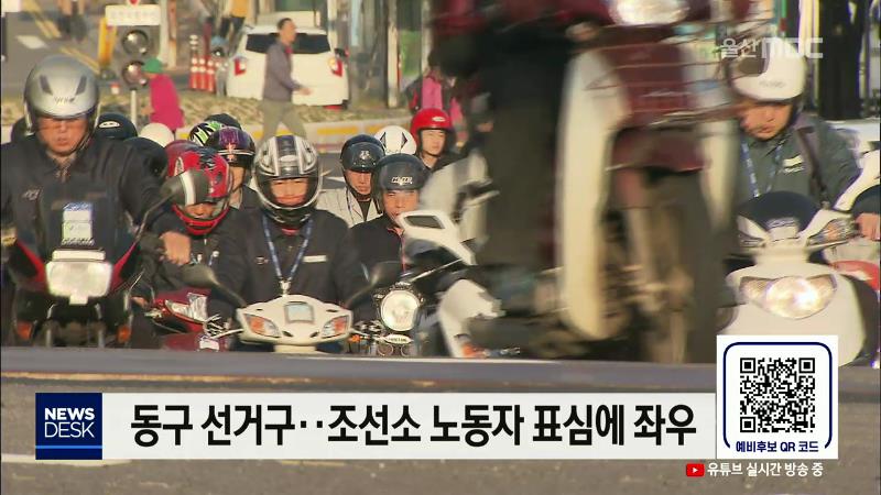 ◀ANC▶ 내년 4.15 총선 6개 선거구에 출마를 준비하는 후보들을 살펴보는 연속 기획, 오늘은 동구입니다. 조선소 노동자가 밀집한 동구는 보수·진보 진영 간 다툼에 여당이 가세하면서 박빙의 승부가 벌어질 것으로 예측됩니다. 그리고 지금 화면에 QR 코드가 떠 있는데요, QR코드를 읽으면 곧바로 울산MBC 유튜브 채널로...