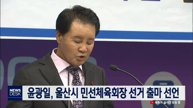 윤광일 전 경남도의원이 오늘(12/18) 울산시 초대 민선체육회장 선거 출마를 공식 선언했습니다. 윤 전 도의원은 울산시 체육회 예산은 180억원으로 광주 400억, 인천 570억원에 비해 턱없이 부족하다며 다양한 예산 확보 방안을 찾겠다고 밝혔습니다. 이에따라 이번 선거는 김석기 전 울산시보디빌딩협회장과 이진용 전 울...