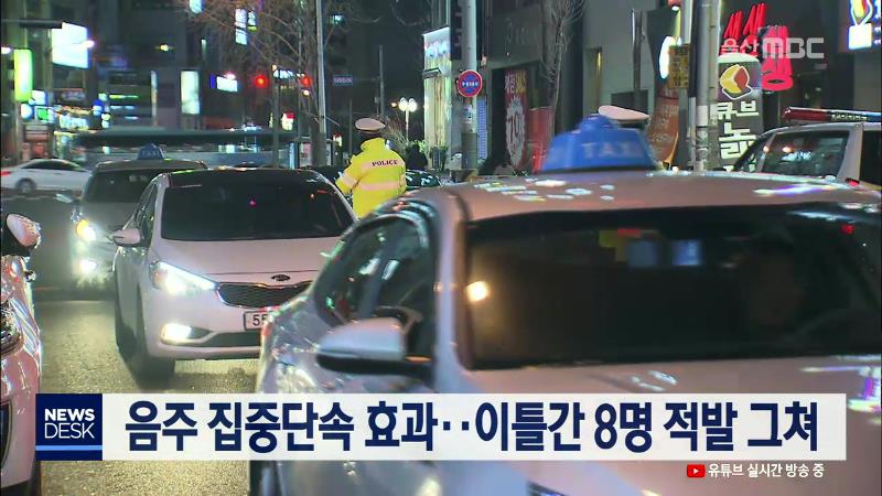 내년 1월까지 음주운전에 대한 정부 합동 집중단속이 시작된 가운데 울산지역 음주운전 적발건수가 크게 줄어든 것으로 나타났습니다. 울산지방경찰청은 지난 16일과 17일 오전 9시부터 다음날 오전 5시까지 음주단속을 실시한 결과 적발건수가 8건에 불과했다고 밝혔습니다. 실제로 올해 1월 1일부터 최근까지 음주운전 단...