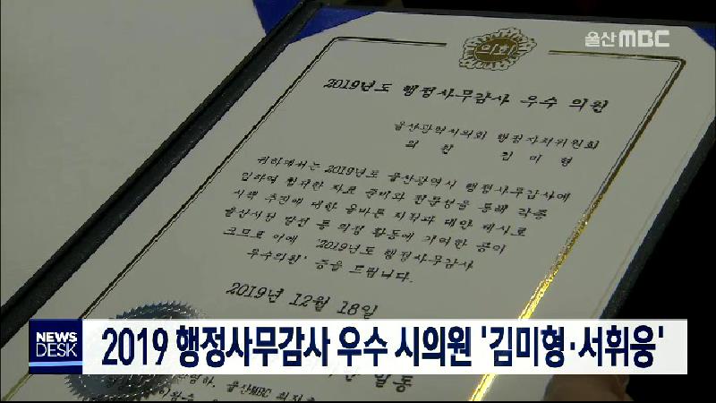 울산시의회 행정사무감사 우수의원에 민주당 김미형, 서휘웅 의원이 선정됐습니다. 두 의원은 시의회 출입기자단 투표에서 날카로운 시각으로 집행부를 견제했다는 평가를 받아 최다 득표를 얻었습니다. 두 의원은 모두 동료 의원들과 함께 의정활동을 한 덕분이라며 시민을 섬기는 초심을 잃지 않겠다고 수상소감을 밝혔습...