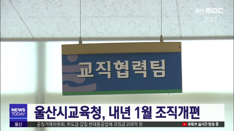 울산시교육청이 내년 1월 1일자로 조직을 개편합니다. 본청은 정책 기획과 조정 업무를 전담하도록 직제를 일부 조정했으며, 민관 협치체제를 구축하기 위해 교육감 직속으로 교육협력담당관을 신설하고, 유아특수교육과와 민주시민교육과, 안전총괄과를 신설합니다. 또 교육지원청은 학교가 직접 처리했던 계약제 교원 채...