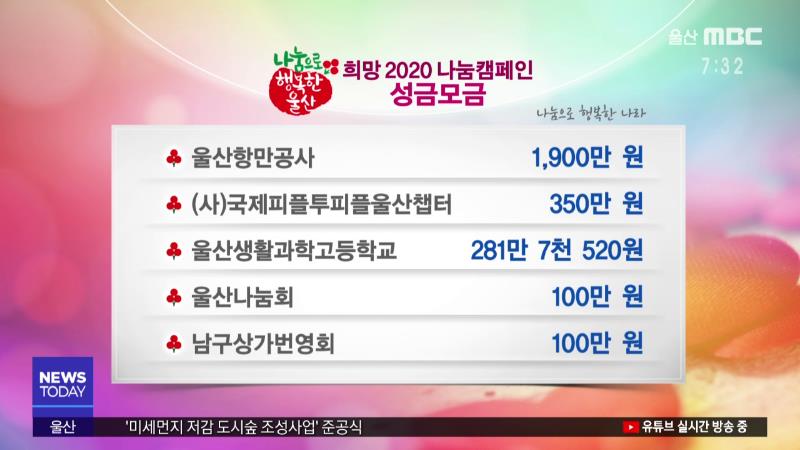 계속해서 '희망 2020 나눔캠페인'에 참여해주신 분입니다. ------------------------------------------- 울산항만공사 1,900만 원 (사)국제피플투피플울산챕터 350만 원 울산생활과학고등학교 281만 7천 520원 울산나눔회 100만 원 남구상가번영회 100만 원 현대중공업 회계세무부문 73만 9천 460원 재울경주향우회내 송죽...