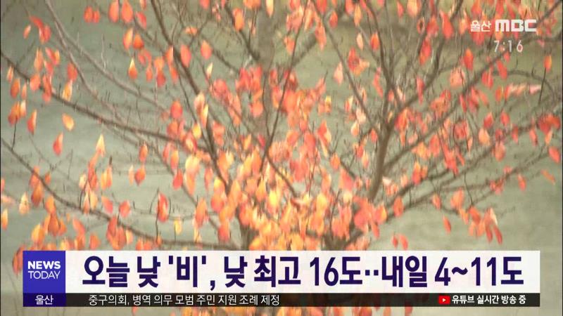 1) 오늘 아침은 우산을 챙겨 출근하시기 바랍니다. 비는 오전부터 오후까지 울산 전 지역에 빗방울을 뿌리겠습니다. 예상되는 비의 양은 5~10mm 내외입니다. 오늘 비가 내리면서 가시거리가 짧고 노면이 미끄럽겠는데요, 교통안전에 유의하시기 바랍니다. 2) 비가 그친 뒤인 밤부터는 찬바람이 불기 시작하겠습니다. 북서...