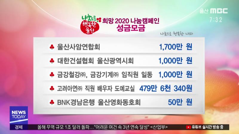 다음은 '희망 2020 나눔캠페인'에 참여해주신 분입니다. ------------------------------------------- 울산사암연합회 1,700만 원 대한건설협회 울산광역시회 1,000만 원 금강철강㈜, 금강기계㈜ 임직원 일동 1,000만 원 고려아연㈜ 직원 배우자 도예교실 479만 6천 340원 BNK경남은행 울산영화동호회 50만 원 -----------...