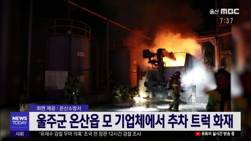 어제(12/16) 저녁 7시 59분쯤 울주군 온산읍 모 기업체에 주차해 있던 5톤 카고 트럭에서 불이나 3천800여만 원 상당의 재산 피해를 낸 뒤 출동한 소방대에 의해 20여분 만에 진화됐습니다. 소방당국은 운전기사가 없던 트럭의 적재함에서 불이 시작된 점 등을 토대로 정확한 화재 원인을 조사하고 있습니다.