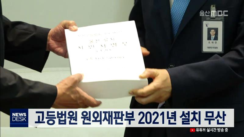 울산 고등법원 원외재판부의 2021년 설치가 무산됐습니다. 울산시와 울산지방법원에 따르면 지난 12일 열린 대법원 사법행정자문회의에서 울산시가 낸 원외재판부 설치 안건이 올라가지 못해 이번 주 열리는 대법관회의에서 논의할 수 없게 됐습니다. 울산시는 광역시 중 유일하게 고등법원이나 고법 원외재판부가 없어 부...