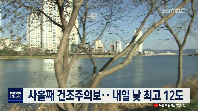 주말인 오늘(12/14) 울산지방은 구름이 많다가 낮부터 맑아져 낮 최고기온은 11도를 기록했습니다. 오늘 밤부터는 동쪽에서 불어오는 바람의 영향으로 빗방울이 떨어지는 곳이 있겠습니다. 내일은 가끔 구름 많은 가운데 4도에서 12도의 기온 분포를 보이겠습니다. 울산기상대는 울산지방에 사흘째 건조주의보가 발효 중이...