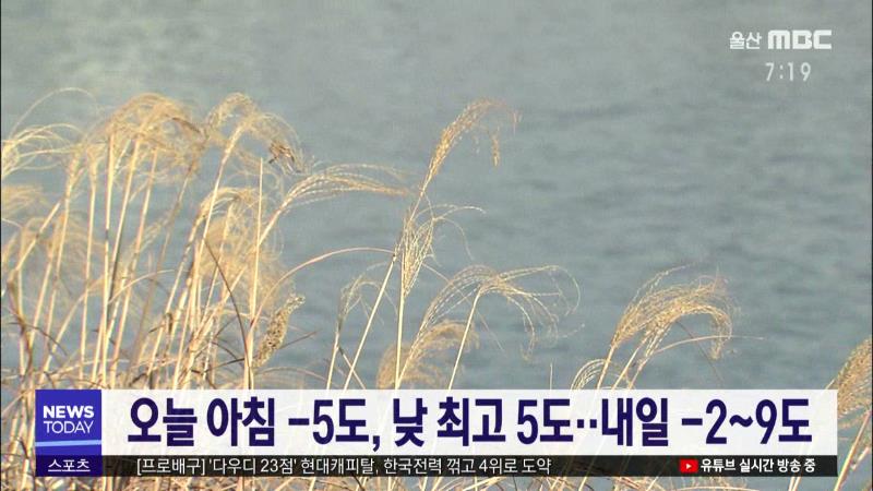 울산은 오늘(12/6) 대체로 맑은 가운데 북서쪽에서 찬 공기가 유입되면서 올 겨울 들어 가장 춥고 건조한 날씨를 보이고 있습니다. 오늘 아침 최저 기온은 영하 5도까지 떨어진 가운데 낮 최고 기온은 5도에 그치겠습니다. 토요일인 내일도 대체로 맑겠으며, 기온은 아침 최저 영하 2도 낮 최고 9도의 분포가 예상됩니다. ...