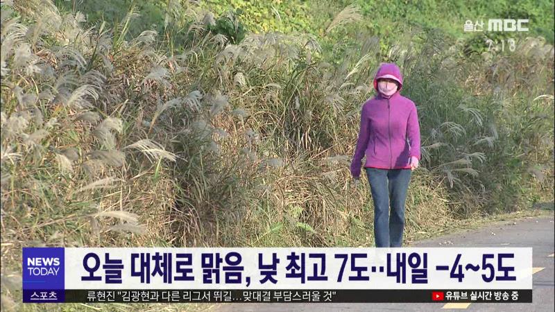 울산은 오늘(12/5) 고기압의 영향을 받으면서 대체로 맑겠습니다. 오늘 낮부터는 북서쪽에서 찬 공기가 유입되면서 낮 최고 기온이 어제보다 3도 낮은 7도에 그치겠습니다. 내일도 대체로 맑은 가운데 기온이 더 떨어져 아침 최저 기온이 영하 4도를 기록하겠으며, 낮 최고는 5도가 예상됩니다. 이번 추위는 토요일인 모레...