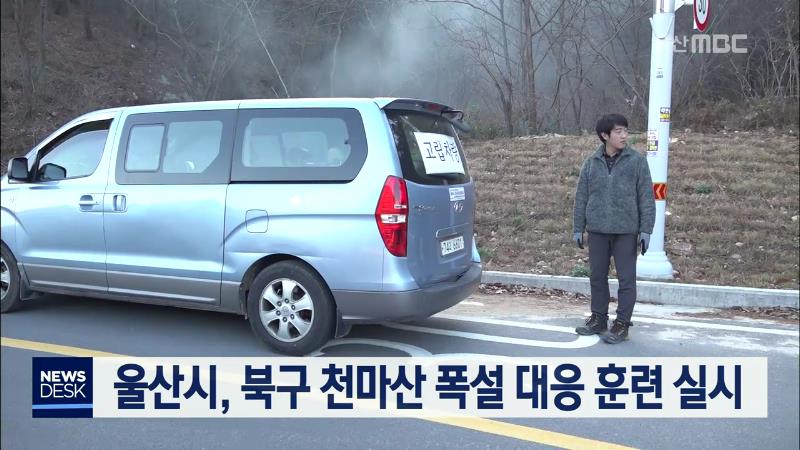 2019년 겨울철 폭설 대응 현장 훈련이 오늘(12/4) 북구 천마산 일대에서 열렸습니다. 이번 훈련은 시간당 5cm의 집중 폭설로 인해 북구 천마산 편백산림욕장 진입로에서 승용차 3중 추돌이 발생한 상황을 가정해 실시됐습니다. 울산시는 제설 전진기지 34곳을 지정해 폭설 피해에 대비하고 있다고 밝혔습니다. //