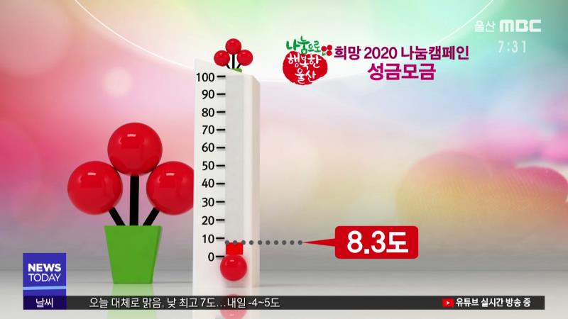 다음은 '희망 2020 나눔캠페인'에 참여해주신 분입니다. ------------------------------------------- 울산공업탑로타리클럽 1,200만 원 대한엔지니어링 100만 원 -------------------------------------------을 기탁하셨습니다. ------------------------------------------- 성금은 한 통화 3천 원의 ARS 전화로도 참여...