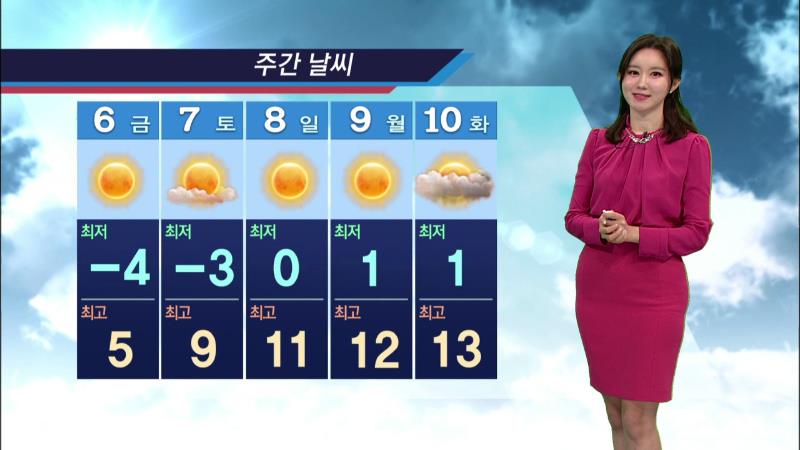 1) 당분간 추위 대비 단단히 하셔야겠습니다. 현재 울산의 기온 2도를 나타내고 있고, 낮부터 북서쪽에서 찬 공기가 유입되면서 한낮 기온은 어제보다 3도 낮은 7도에 그치겠습니다. 내일은 기온이 더 떨어져 아침 최저 기온이 영하 4도까지 뚝 떨어지겠습니다. 체감온도는 영하 8도까지 내려가겠습니다. 2) 오늘 낮부터는...