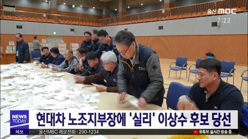 강성과 실리 후보가 맞대결한 현대자동차 노조지부장 선거에서 실리 성향 이상수 후보가 근소한 차이로 당선됐습니다. 현대자동차 노조는 어제(12/3) 실시된 지부장 선거 개표 결과, 이 후보가 49.91%의 득표율로 강성 성향 문용문 후보를 405표 차이로 따돌리고 당선됐다고 밝혔습니다. 이 당선자는 호봉 승급분 재조정과 ...
