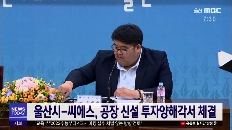 울산시와 씨에스는 오늘(12/3) 시청에서 승강기용 와이어로프 생산공장 신설을 위한 투자양해각서를 체결했습니다. 씨에스는 울주군 온양읍 지더블유(GW) 일반산업단지의 2만3천여 제곱미터 부지에 227억 원을 투자해 내년 8월까지 승강기용 와이어로프 제작 공장을 짓고, 시는 인허가 등 신속한 행정 지원에 나서기로 했습...