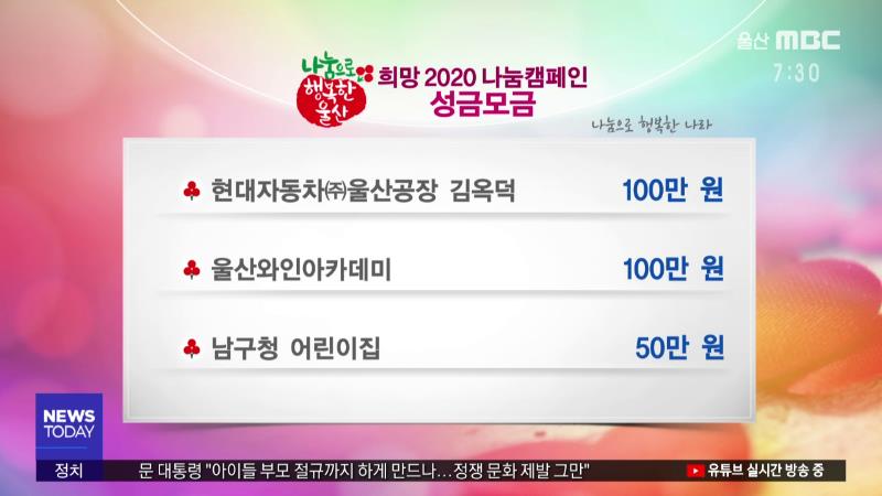 다음은 '희망 2020 나눔캠페인'에 참여해주신 분입니다. ------------------------------------------- 인석의료재단 보람병원 2,000만 원 삼두종합기술㈜ 1,500만 원 울산사립유치원연합회 1,000만 원 현대자동차㈜울산공장 김옥덕 100만 원 울산와인아카데미 100만 원 남구청 어린이집 50만 원 -------------------------...