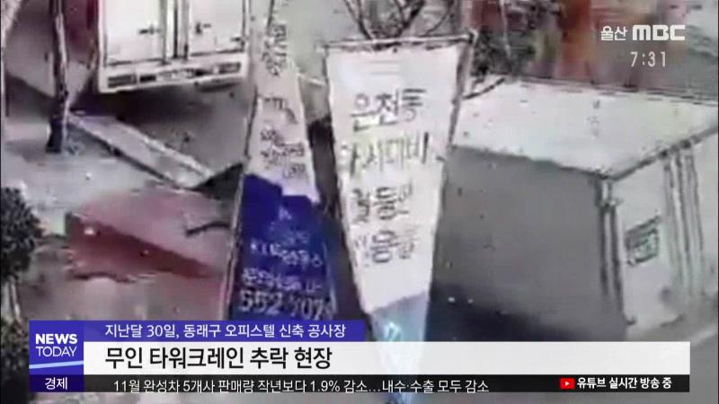 ◀ANC▶ 지난 주말 부산 동래 온천동의 공사장에서 아찔한 타워크레인 추락 사고가 있었죠. 사고가 난 타워크레인은 사람이 직접 타지 않고 원격조정하는 무인 크레인었는데, 편리성과 비용 절감을 노린 무인 크레인, 하지만 안전은 담보할 수 없다는 지적입니다. 부산 김유나 기자입니다. ◀VCR▶ 차와 사람이 지나다니...