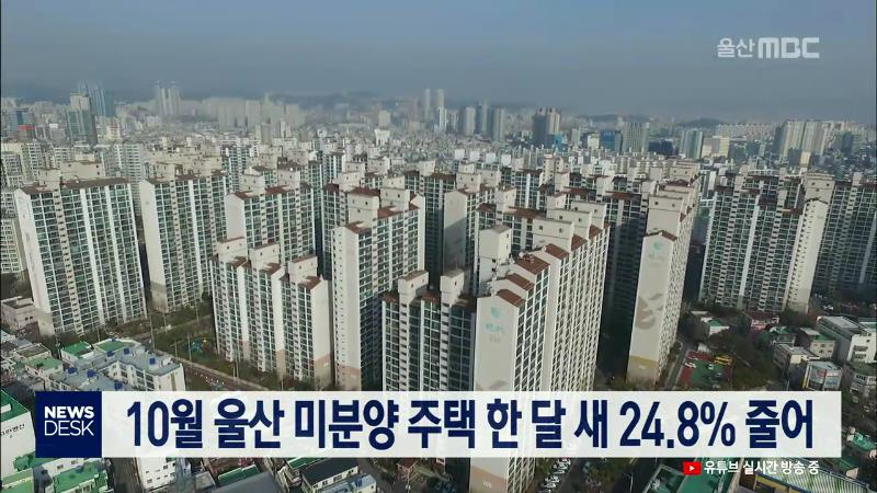 ◀ANC▶ 울산의 미분양 주택이 한달새 25% 가까이 줄어든 것으로 나타났습니다. 소비자심리지수가 20개월 연속 기준치 아래에 머물렀습니다. 경제브리핑, 이돈욱 기자입니다. ◀END▶ ◀VCR▶ 울산 주택시장의 가격 상승전환과 매매거래량의 증가로 10월 한달간 미분양 주택이 24.8%나 감소했습니다. 국토교통부에 따르...